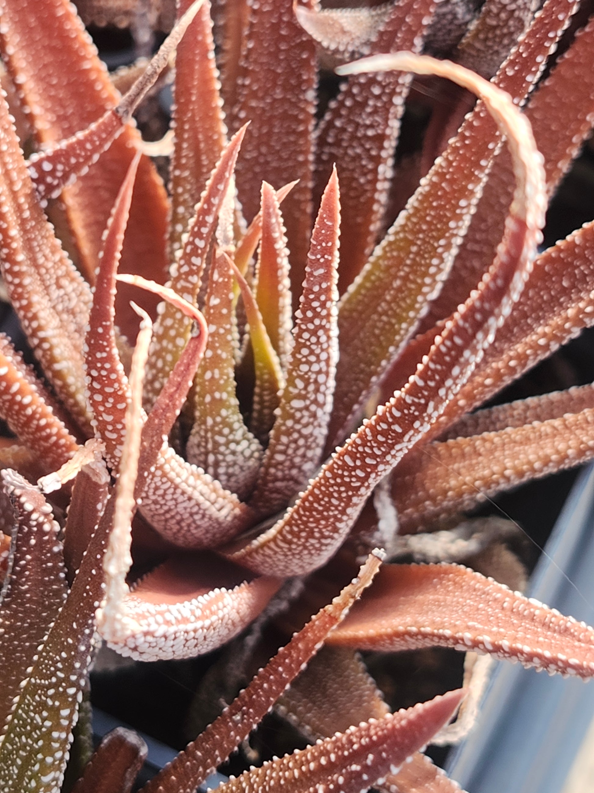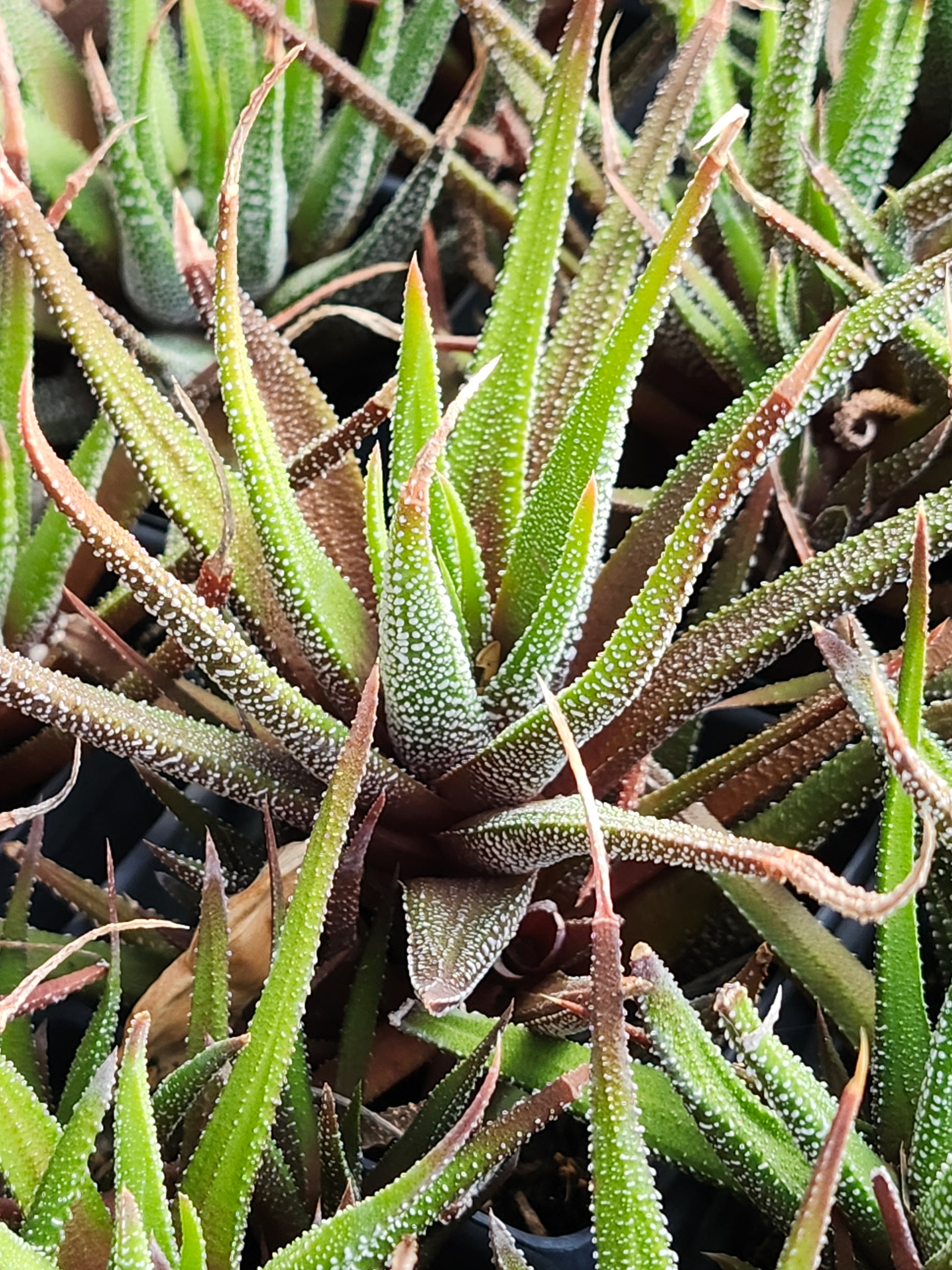 While it shares the classic rosette growth habit and hardy nature of its Aloe cousins, the African Pearls stands out with its intricate white tubercles that dust the leaves like fine beadwork. Depending on light exposure, its foliage can range from a deep, lush green to a dramatic sunset bronze.